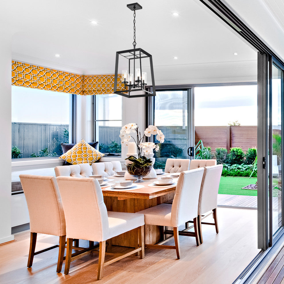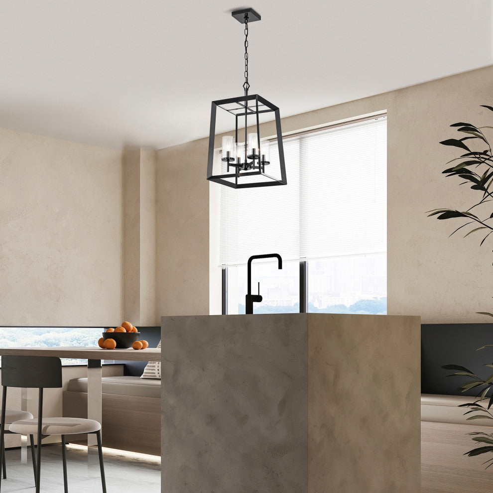 A modern take on the classic lantern style chandelier, the Richard 4-light pendant offers plenty of light. Defined by an antique black open work frame, this chandelier features four E12 candelabra style bulbs (not included) encased in a clear glass cylinder shade. This sleek cage pendant light is perfect for traditional, transitional, and farmhouse interiors. Place this lantern pendant light above the entryway, kitchen table, or dining room to grace your home with minimalist style and bright illumination. For ease of installation, this light fixture comes equipped with a 40 in. chain that may be shortened by removing some links to suit a variety of ceiling heights and room sizes. This light is also compatible with a dimmer switch when installed with dimmable bulbs, allowing you to adjust your light levels accordingly.