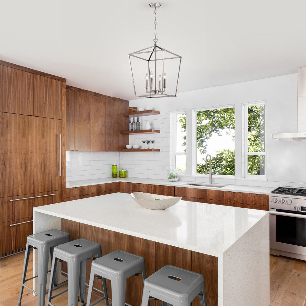 This popular Modern Farmhouse design is the perfect addition to any kitchen, entryway, or dining room. Add 2 or more over a kitchen island for a bold statement. The brushed nickel finish gives it versatility, use four LED, dimmable, or Edison style bulbs to create a custom look. It comes with brushed nickel candle sleeves and a 40-inch adjustable chain for even more customization.