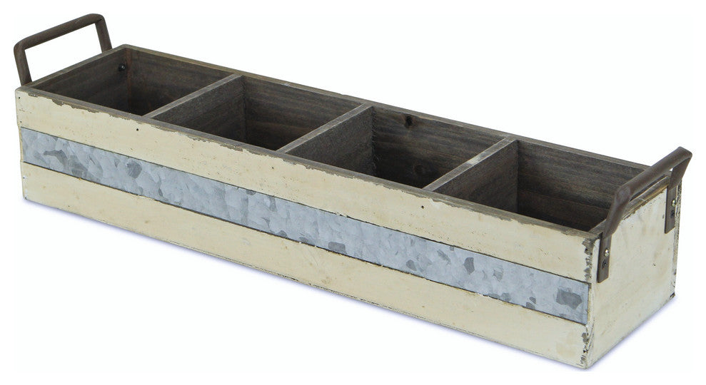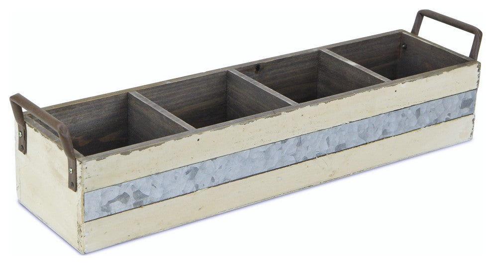 Add a touch of rustic charm to your home or garden with the 4-Slot Two-Tone Wooden Crate. An eye-catching piece, this stunning crate is not only great for storage, but also a beautiful accent piece. Featuring four storage slots, weathered hues of white and blue, and metal side handles, the 4-Slot Two-Tone Wooden Crate is both stylish and functional. A lovely addition of industrial elegance, the 4-Slot Two-Tone Wooden Crate allows you to stay organized without sacrificing style.