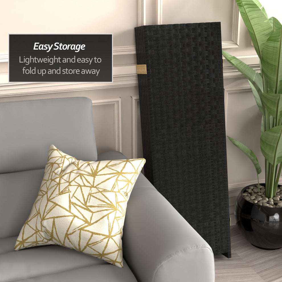 4' Tall Woven Fiber Room Divider, Black, 6 Panel