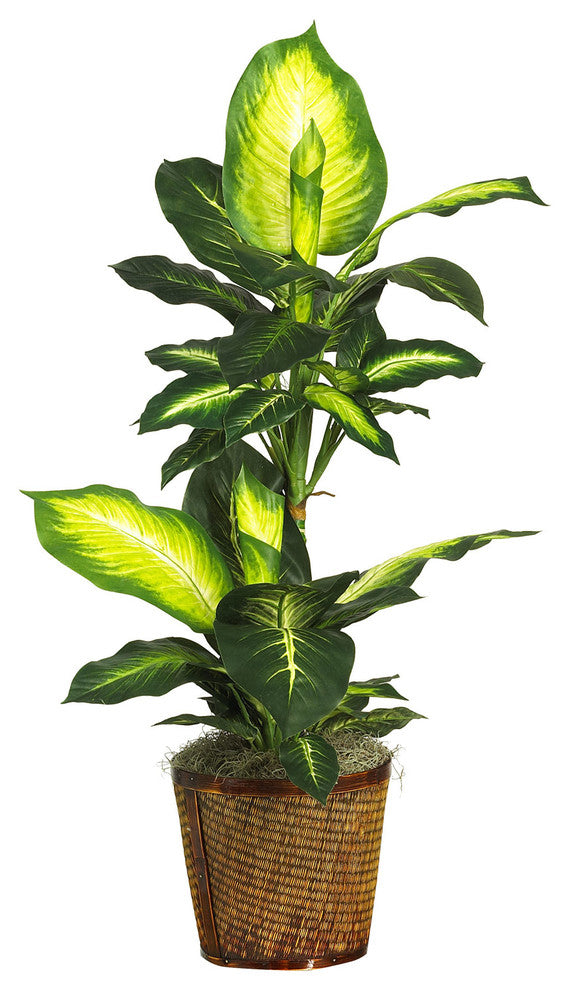 Does your office lack a focal point? At 3feet tall, this illuminating Golden Leaf Dieffenbachia silk plant is sure to become the center of attention. Bold, brilliantly colored leaves are the secret to this plant''s success. Jokingly coined the ''Mother in Law Plant'', you won''t have to worry about your pets ingesting any harmful milky sap from this authentic reproduction. A charming wicker basket filled with moss adds a nice finishing touch.
