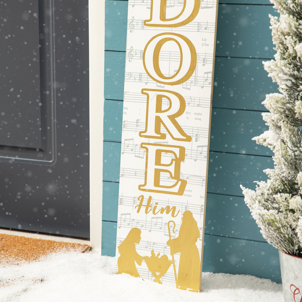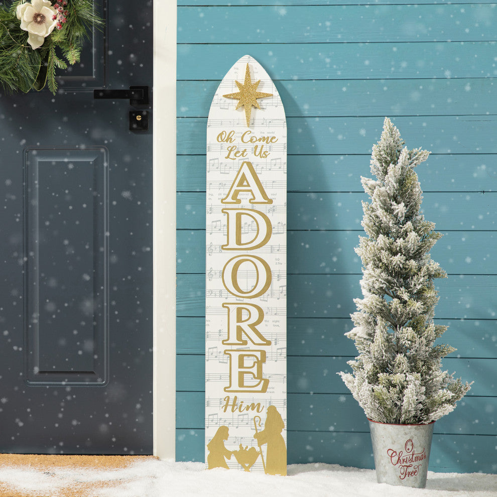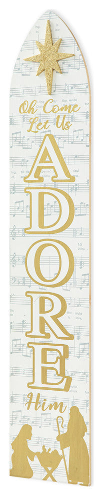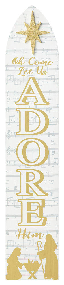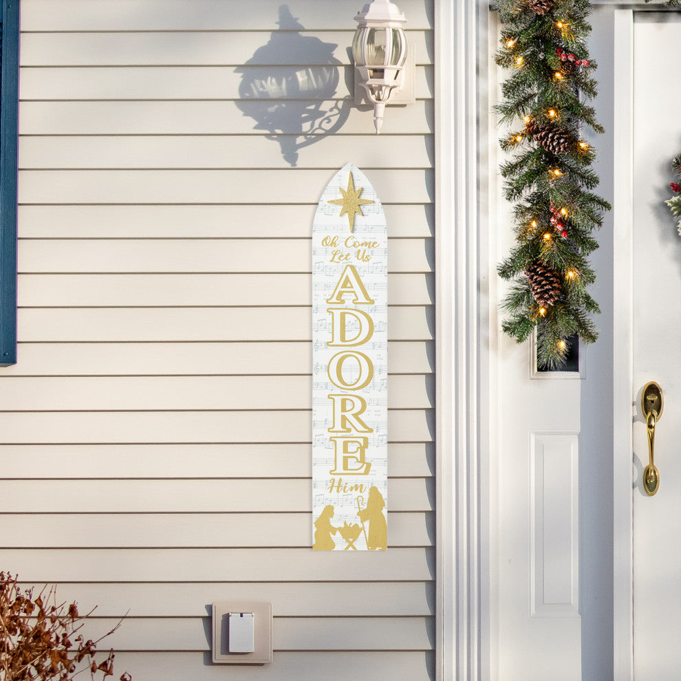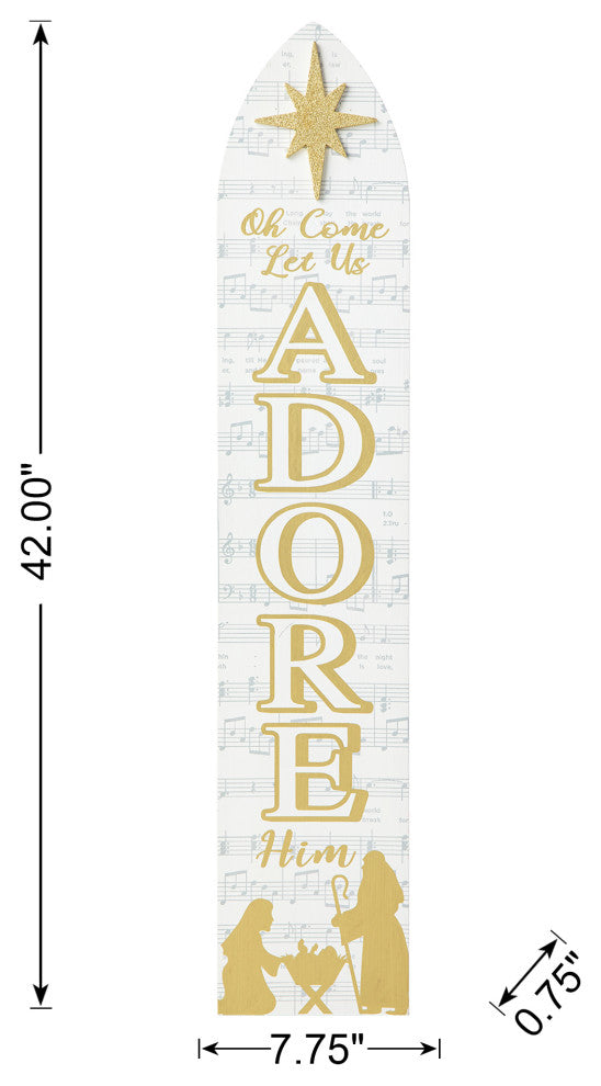 "Enhance your holiday decor with this church shaped sign. It features festive phrases in gold which say "Oh come let us adore him" with eye-catching fonts on white background. And with music notes in grey and golden North Star, religious and festal emblems will fill your Chritsmas celebration with peace and love.1. Material: 100%Solid.2. Size: 7.75"Lx0.75"Wx42"H.3. Two Functions, wall decor or porch sign.4. For indoor and covered porch use.5. No assembly required. 6. Due to handmade nature, the glitter could slightly falling off."
