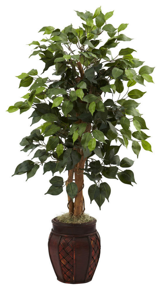 Unlike the real Ficus tree (which is finicky and practically leafless in almost any home light conditions), our Ficus tree is eternally verdant and deep green with 378 individual leaves on natural trunks. Measuring forty four inches in height, this wonderful reproduction Ficus would look lovely in a picture window, home entranceway, or even the office. Complete with a decorative planter this handsome tree is ready to go