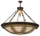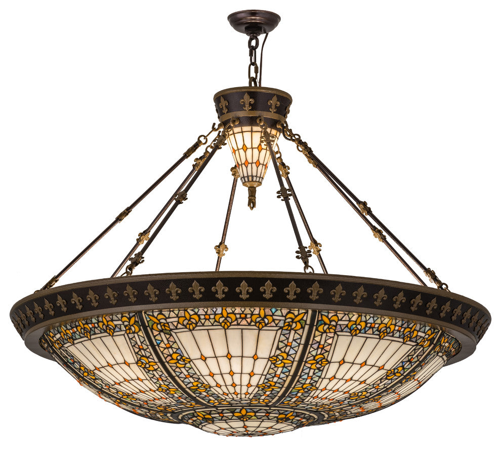 A Meyda Tiffany original design, the Fleur-de-Lis inverted pendant is an intricate design of Yellow tri-pedaled irises and Azure colored jewels against Crimson and Cobalt bands. Reminiscent of castle and cathedral glass, the fleur-de-lis pattern holds a prominent place in French Heraldry. Intricately detailed hardware, hand finished in Mahogany Bronze with Antique Gold accents, cradles a stained glass shade and lighted hub which are hand crafted utilizing the copper foil construction process.