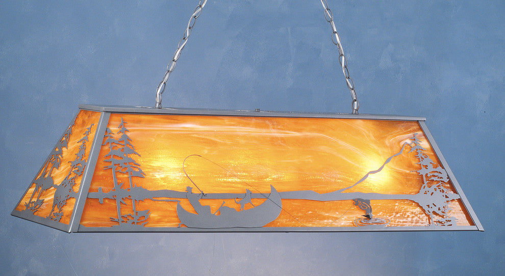 A fisherman casts his line into tranquil waters for the catch of the day on this handsome oblong pendant shade. The fixture is finished in Pewter, has Amber art glass panels, and is handcrafted in the USA by Meyda artisans.