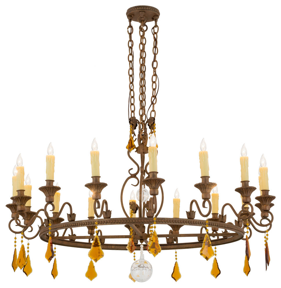Sparkling elegance and shimmering opulence come to light with a beautiful combination of crystal, candlelight and hardware in gold. 16 Ivory colored perched on bobeches with scrolled arms embrace a circular metal frame, which is adorned with Amber Crystal droplets and Clear Crystal accents. The hardware and frame are featured in an exquisite Cortez Gold finish. Handcrafted in the USA, this fixture is available in custom sizes, styles and colors, as well as with dimmable energy efficient lamping options. The chandelier is UL and cUL listed for damp and dry locations.