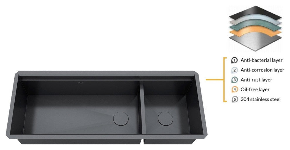 Constructed by premium grade 16 gauge extra-thick 1.5mm thick Stainless Steel with Nano Black Titanium plating. Fully coated and equipped with sound-deadening pads and protective undercoating around the sink.