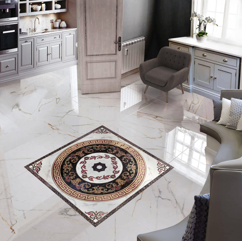 Classic design Center Piece made from the finest Porcelain. With Carrara Coloring, and gold veins for a spectacular look.48"x48"Made of 4 PiecesPorcelain tileGlow in the dark