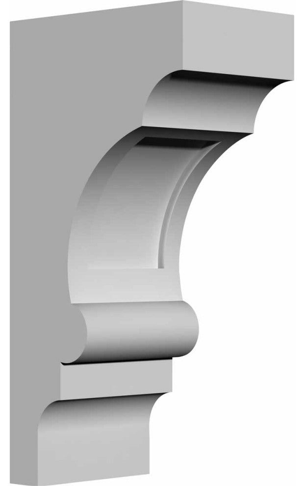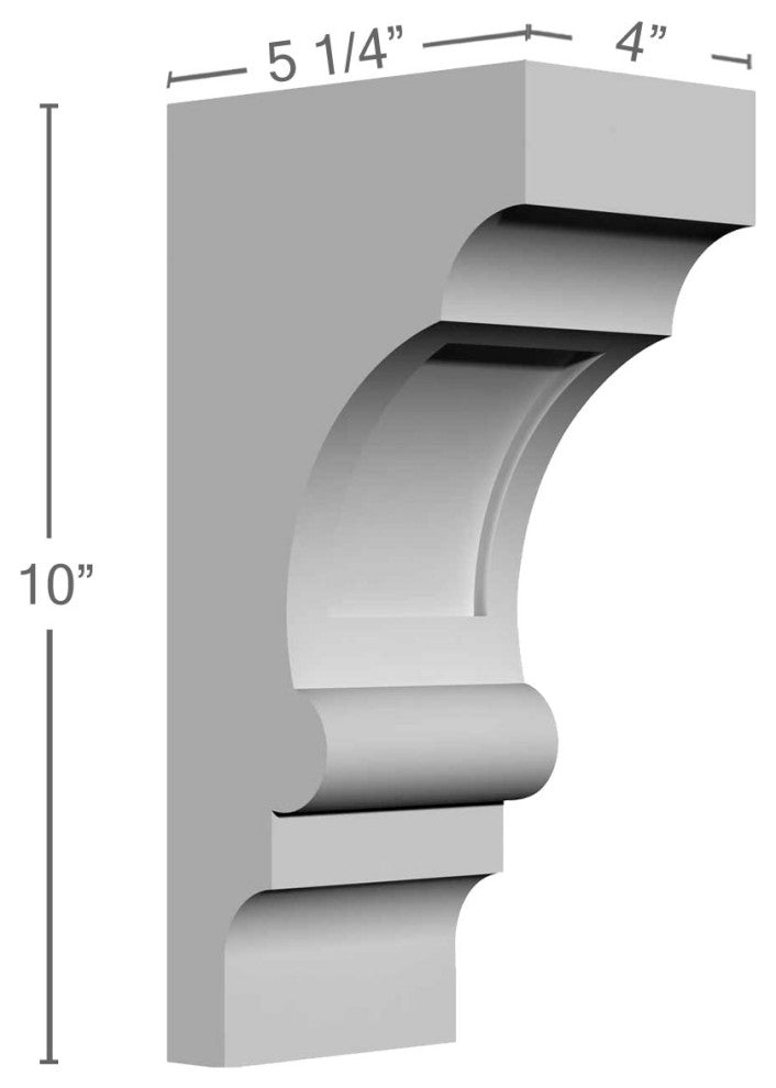 4"W x 5 1/4"D x 10"H Diane Recessed Corbel. These brackets are truly unique in design and function. Primarily used in decorative applications urethane brackets can make a dramatic difference in kitchens, bathrooms, entryways, fireplace surrounds, and more. This material is also perfect for exterior applications. It will not rot or crack, and is impervious to insect manifestations. It comes to you factory primed and ready for your paint, faux finish, gel stain, marbleizing and more. With these corbels, you are only limited by your imagination.