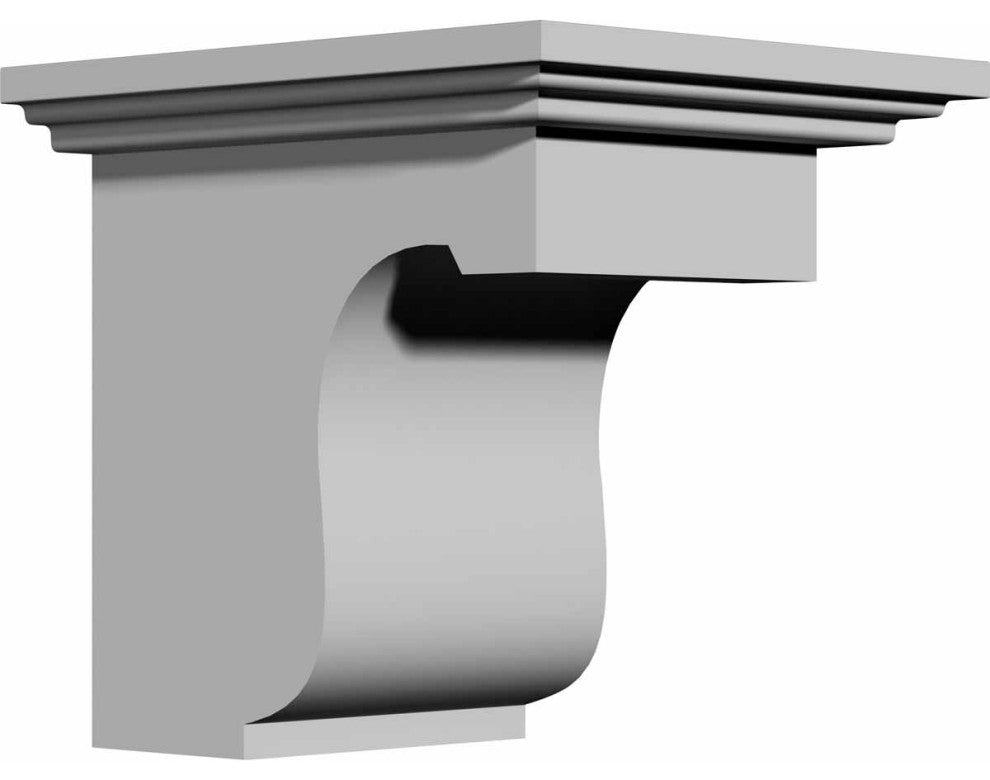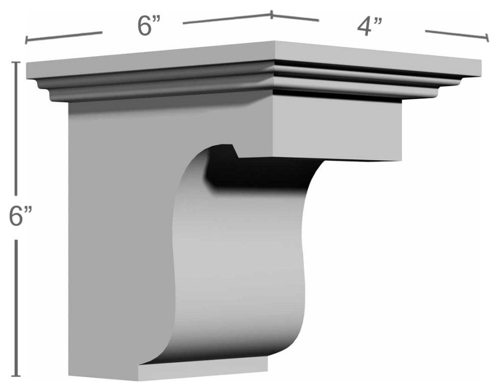 4"W x 6"D x 6"H Legacy Bracket. These brackets are truly unique in design and function. Primarily used in decorative applications urethane brackets can make a dramatic difference in kitchens, bathrooms, entryways, fireplace surrounds, and more. This material is also perfect for exterior applications. It will not rot or crack, and is impervious to insect manifestations. It comes to you factory primed and ready for your paint, faux finish, gel stain, marbleizing and more. With these corbels, you are only limited by your imagination.