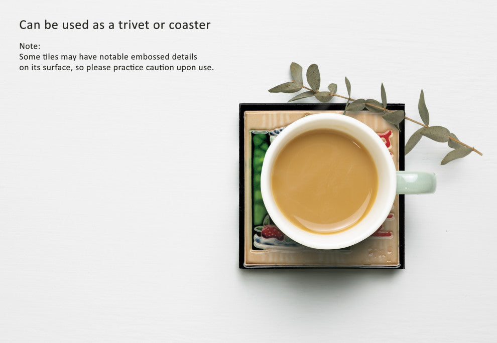 Each tile is hand crafted, hand glazed, and kiln fired to show the most vibrant colors of ceramic arts. Due to the slow firing and cooling nature of the process, our products can take sunlight, moisture, stain, heat, and the color will remain the same. This superior durability makes them great for all kinds of applications as well as both indoor and outdoor display. For convenience, the art tiles come with backings which enable them to stand by themselves like picture frames or be hung on the wall with a nail.