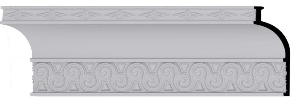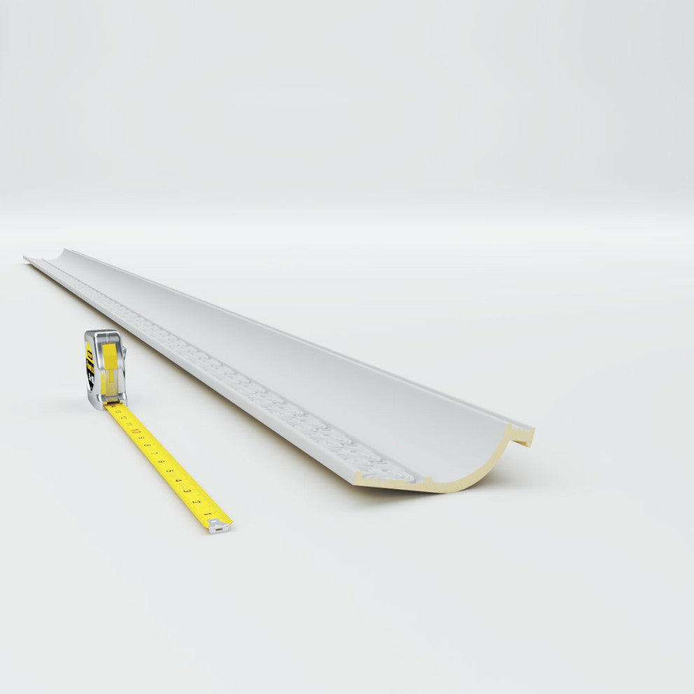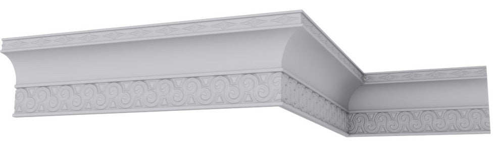 5 5/8"H x 2 1/4"P x 6"F x 96"L, (2 1/8" Repeat), Bedford Crown Moulding. Our beautiful panel moulding and corners add a decorative, historic feel to walls, ceilings and furniture pieces- They are made from a high-density urethane which gives each piece the unique details that mimic that of traditional plasting and wood designs but at a fraction of the weight- This means a simple and easy installation for you- The best part is that you can make your own shapes and sizes by simply cutting the moulding pieces down to size and then butting them up to the decorative corners- These are also commonly used for an inexpensive wainscot look-Features- Modeled after original historical patterns and designs-- Constructed from solid urethane for maximum durability and detail-- Lightweight for quick and easy installation-- Factory-primed and ready for paint or faux finish-- Can be cut, drilled, glued and screwed-- Designed for use on both interior and exterior applications-- Material- Urethane