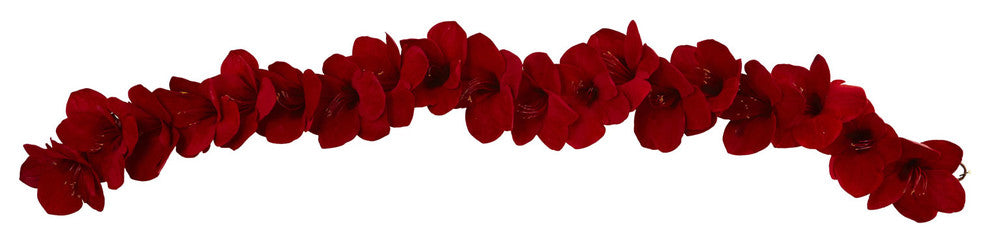 Brilliant red Amaryllis is beautifully embellished into a garland arrangement. Measuring 5'' long, each Amaryllis bloom is constructed in detail to accentuate the deep red hues of a true flower. String the florals atop the fireplace mantel with candles and seasonal decor for the perfect holiday arrangement.