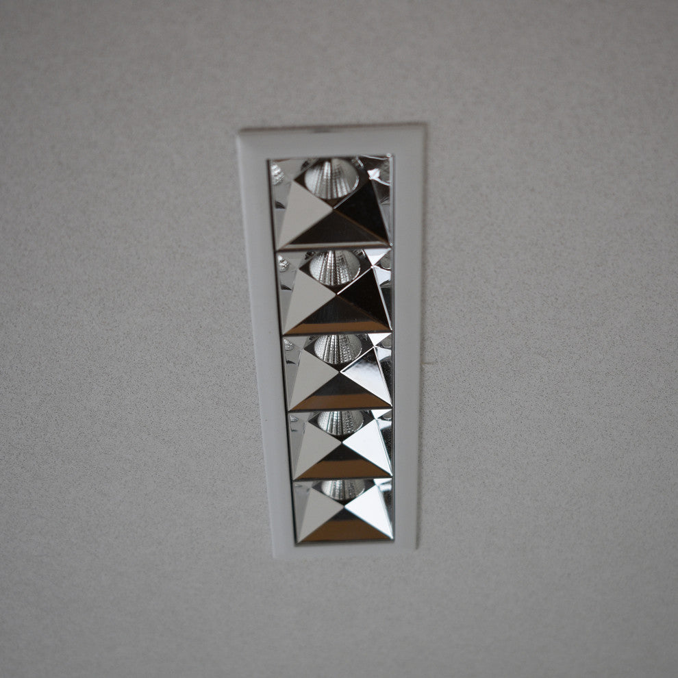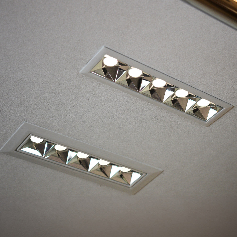 LED Adjustable trim downlight, RUBIK Series• Aluminum body structure available in White finish• Integrated LED 5-spot fixture, recessed installation with remote driver (included)• IC Rated• Adjustable 15° to the left or right• DIMENSIONS: 7.25"L x 2.5"W x 2.25"H• HOLE SIZE: 7"L x 2.25"W• ELECTRICAL BOX DIMENSIONS (for included remote driver): 8.46"L x 1.77"W x 1.57"H• LENS BEAM ANGLE: offered in 4 beam angles 12°, 20° & 48°(special order required), 34°(stock beam angle)• STOCK BEAM ANGLE: 34°• DIMMABLE: 0-10V• CCT: 3000 Kelvin color temperature• BRIGHTNESS: 728.83 Lumens• WATTAGE: 12W• VOLTAGE: 100-277V• CRI 90: is the highest measurement of light about the accuracy of color appearance• IP Rate: IP20 (dry rated)• ETL, cETL, Title 20 Compliant, Title 24 Compliant, Prop 65 Compliant, Energy Star Compliant• 3 Year Limited Warranty• • • THE MEASUREMENTS ARE ROUNDED TO THE NEAREST 1/4"• • •