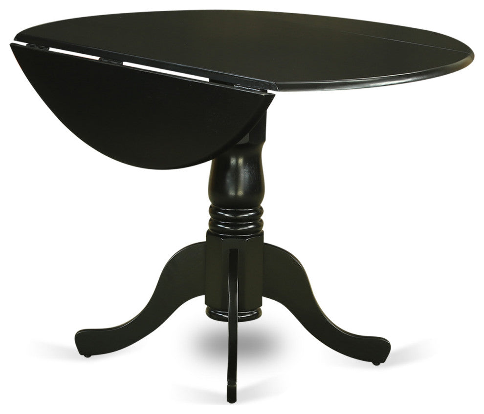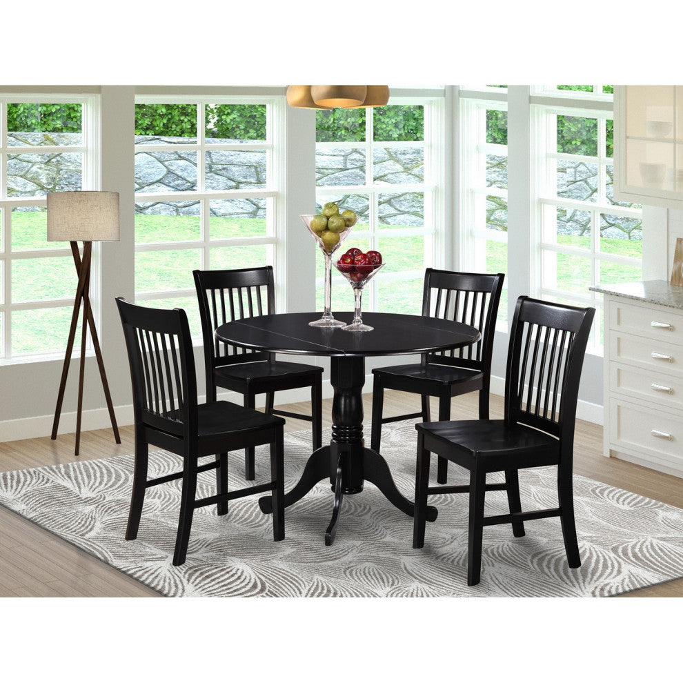 The Dublin drop leaf small dinette set are of modest dimension, that''s best for smaller dining area. Crafted out of Asian hardwood, the round dining table set is finished with a brilliant color.The small dinette set match beautifully with any traditional kitchen or dining-room.Held up by an one pedestal, this type of rounded kitchen dining tables also presents useful two drop leaves. It''s measurements makes the fantastic small dinette set for first-time shoppers or moderate homes.The dining room chairs showcase charming structure for added high level of comfort and back support.• This wonderful kitchen table set consists of a lovely breakfast table and 4 awesome wood dining chairs. Our great kitchen chair has 4 hardwood legs and a slatted back. This kitchen dining table consists of a round top, pedestal legs and two 9-inch drops leave that will enhance the beauty of your dining-room. You can make your dining area beautiful and get elegant charm by adjusting our dining room table set there.• Stunning small dining table set color is black that"™s a reason wood dinette set matches easily to any kitchen décor and delivers the kitchen an incredible glance. We have painted this set with the help of expensive and irremovable colors. Our mid century dining chair seat is constructed from wood which provides a great sitting experience.• Dimensions of the fantastic dinette table are: length 42; width 42; Height 29. The dimensions of the stunning dining room chair are: Width 19; Depth 18; Height 35.