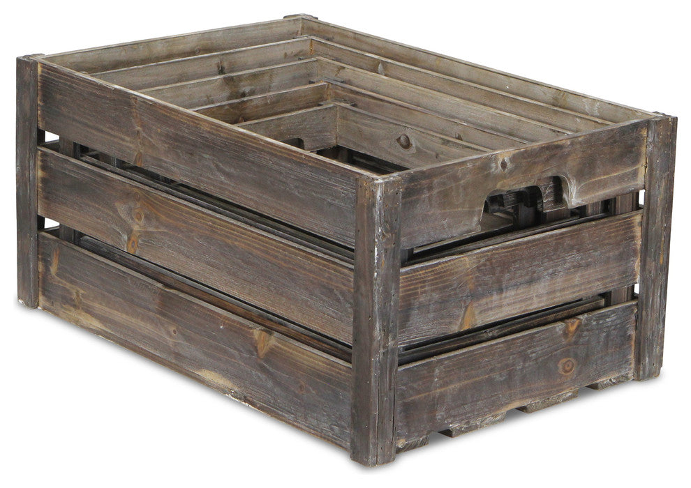 Add a touch of rustic charm to your home or garden with the Wood Slat Crates. Sold as a set of five, these eye-catching crates are not only great for storage, but also beautiful accent pieces as well. Featuring a natural wood finish and wood slat sides, the Wood Slat Crates are both stylish and functional. A lovely addition of natural, woodsy elegance, the Wood Slat Crates allow you to stay organized without sacrificing style.Dimensions: Extra Large: 20"x13.5"x9.25", Large: 17.5"x12"x8.75", Medium: 15.25"x10.25"x8", Small: 12.5"x8.5"x7", Extra Small: 10.5"x7"x6.25"