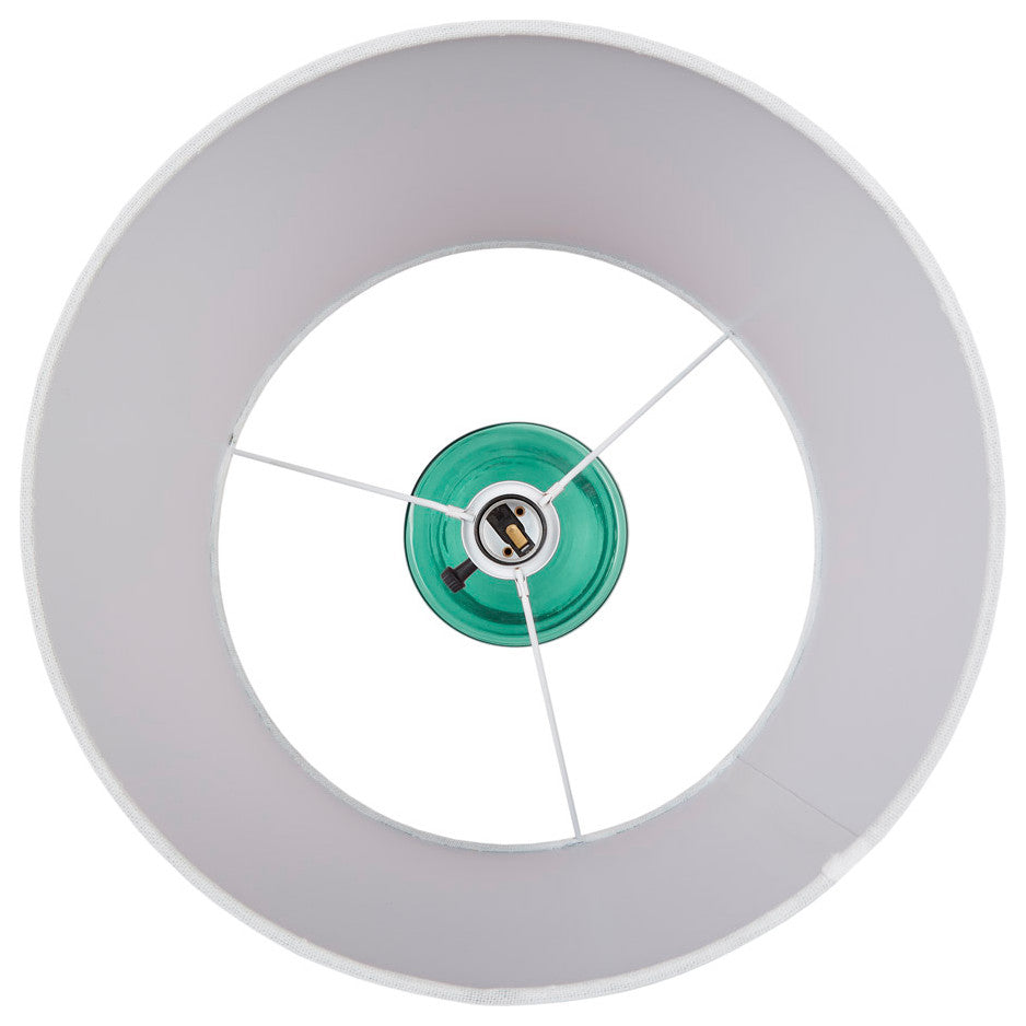 DESCRIPTIONInfuse your space with personality with the 510 Design Neonova table lamp. Boasting a sleek glass body in a captivating blue hue, it''s paired with a matching metal base and center rod for a cohesive look. The white drum-shaped shade adds a chic contrast while softly filtering light to emit a warm glow. Equipped with an on/off rotary switch and included LED bulb, it''s as stylish as it is functional. Spot clean only. Illuminate your room with charm and flair using this delightful lamp!FEATURES? 510 Design? A glass table lamp in a capivating pink hue? Matching pink metal base and center rod create a cohesive look? On/off rotary switch on socket. Plug-in, 60" clear colored cord.? 1 Type A bulb is needed, wattage 60W incandescent/13W CFL/9W LED; One 9W LED light bulb is included? Polarized plug; Not dimmable? Spot clean only? 2 year limited warrantyMATERIALS60% glass, 20% iron, 20% polyesterBase: Glass and ironShade Fabric: PolyesterSIZE DESCRIPTIONOverall:12"Dia x 20.5"HBody:4.75"Dia x 10.25"HShade:12"Dia x 9"HSocket:1.25"Dia x 2"HCord:60"H
