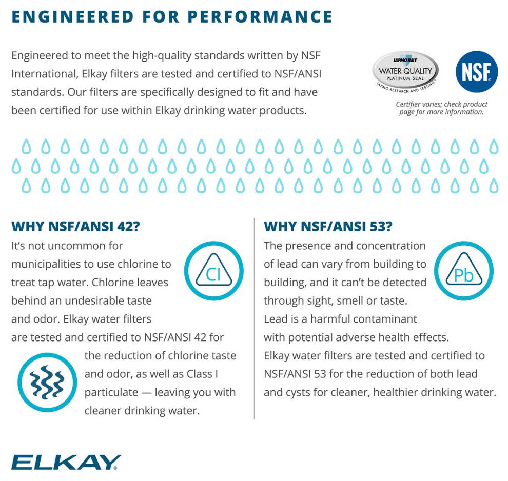Water filters provide cleaner, great tasting water for drinking fountains, water coolers and bottle fillers. All of our filters are made with activated carbon to improve taste and odor. Many also reduce contaminants such as lead. Elkay"™s filters are easy to connect and are self-contained replaceable cartridges, limiting exposure to contaminated media.•Replacement filter for models with WaterSentry VII filtration system (Coolers + Fountains).•Filter should be replaced every 1,500 gallons or 1 year after installation. Please note, some Elkay filters will ship with a clear cap, instead of a red cap. While colors of filter caps may vary based on inventory levels, there is no effect on filter performance.•Designed to reduce lead, particles, and chlorine. Also reduces odors and discoloration from incoming water.•Filter is certified to NSF 42 and 53 for lead, particulate class 1, chlorine, taste, and odor reduction.