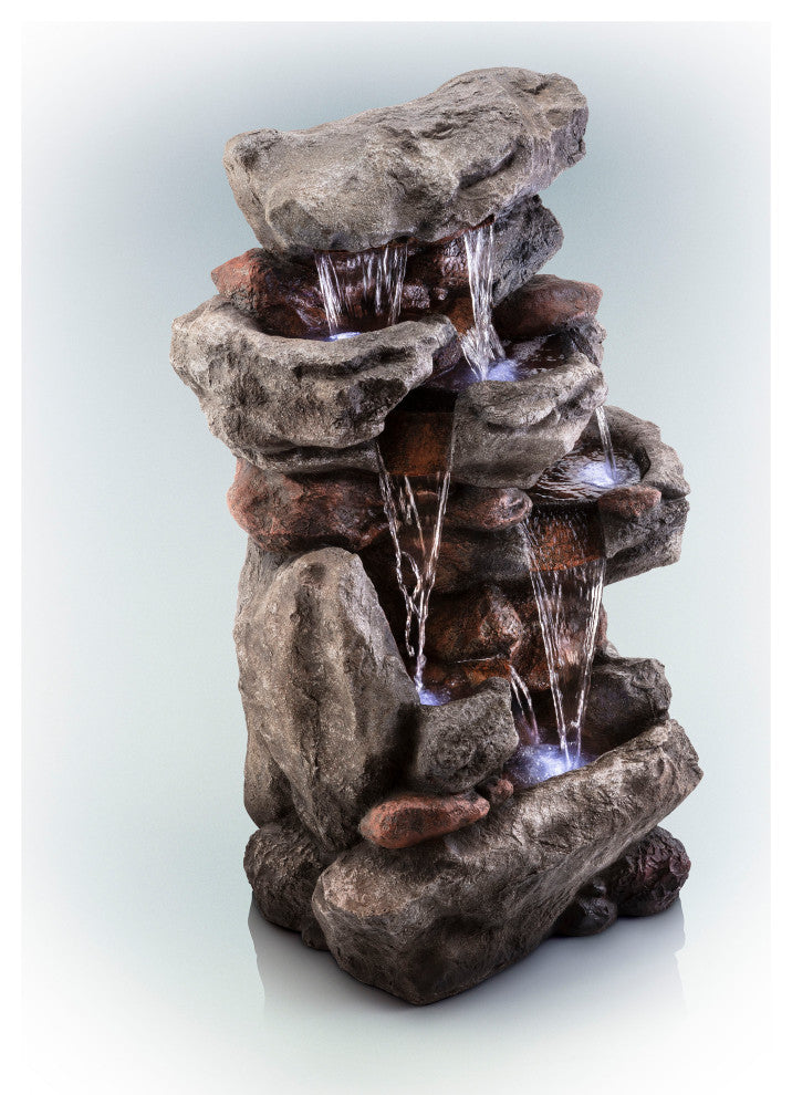 Relax and enjoy the sounds of nature with the Alpine Corporation 5-Tier Rock Fountain! With this high-quality fountain, you can create a meditative, relaxing atmosphere, even in an urban jungle. The waterfall looks great in your garden, patio, deck, porch, or yard space. Take in the tranquil sounds of the water gently cascading over natural-looking gray and brown stone. The polystone and fiberglass construction is weatherproof, rust-resistant, and durable for years of quality use. To use, simply plug into an outdoor outlet, fill lower level with water, and watch as the interior pump creates a lovely water flow reminiscent of a lush rainforest. 6 LED lights in each of the 5 tiers illuminate your space, drawing attention to the relaxing water pools day or night for added ambiance. With a 1-year warranty, you can be confident in the quality of your purchase. Fountain measures 33"L x 24"W x 52"H for use in yards of any size. Alpine Corporation is one of America''s leading designers, importers, and distributors of superior quality home and garden decor products. Alpine Corporation''s award winning in-house design team continuously develops new and innovative "statement pieces" for your home and garden. Your indoor and outdoor living spaces will be the envy of the neighborhood with our wide assortment of fresh, fashionable and contemporary products, from beautifully crafted solar garden stakes featuring patented motion and fiber optic lighting technology to beautiful fountains and delightful bird baths and feeders.