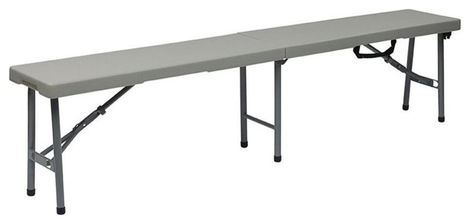 6'' Light Gray Resin Fold in Half Bench Powder Coated Tubular FrameFind the extra seating for family BBQs, sporting events, or even the workplace with this multi-purpose folding bench. You"™ll find this practical bench boasts a high-quality steel tube frame built for long-lasting use and lightweight portability. Other features include non-marring foot caps to protect floors from scratches, a carrying handle, and a folding center for easy storage and transportation. The quality resin surface is waterproof and easy to clean; offering both impact and scratch resistance. Ideal for both indoor and outdoor use, this utility bench arrives fully assembled and ready to go for your next social gatheringFeatures: • 6 foot Fold in Half Bench • Durable Construction • Light Weight Sleek Design • Powder Coated Tubular Frame • Ideal for Indoor or Outdoor Use • Meets or Exceeds Test Standards (BIFMA and MTL)Specifications: • Product Dimensions: 17.5" H x 72.5" W x 12" D • Product Weight: 20 lbs. • Assembly Required: No • Weight Capacity: 225 lbs