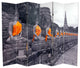 This six panel screen features sharp black and white compositions of Buddha statues adorned with festive sashes, colorized a brilliant saffron orange. These peaceful, beautiful images will add a serene decorative accent to your living room, bedroom, dining or kitchen. This room divider has different images on each side, as shown.