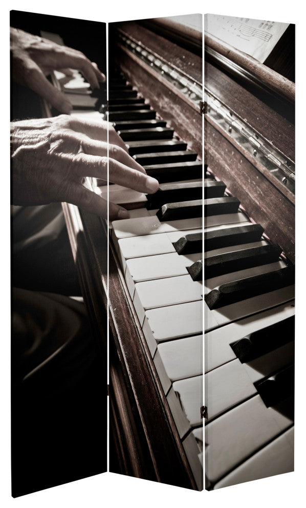 Soothe the savage beast with these two remarkable images, meaningful to any music lover, whether your style of choice is Jazz, Rock, Folk, Classical, or both Country and Western. On the front is an interestingly angled close up photograph of venerable hands dancing across the keys of an upright piano. On the back are eight passionate lines of hand written sheet music with the time signatures cropped away. These evocative pieces of photographic art will bring attractive, beautiful decorative accent to your home, clubhouse, TV room, living room or bedroom. This three panel screen has different images on each side, as shown.