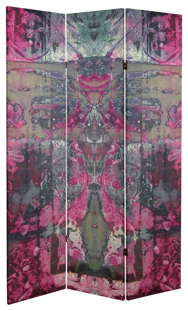 A tantalizing composition reminiscent of galaxies, tie-dyed fabric, and Rorschach blots, this eye-popping design looks stunning on these three six-foot canvas panels. Encompassing a blend of colors from fuchsia to steel blue, this lightweight screen is equally suited as a captivating centerpiece or a room-brightening accent to your dÔøΩcor. Featuring hypnotic folds, symmetrical swirls, and limpid pools of color, you may easily lose yourself gazing into this mesmerizing image. Designed to divide a room but also great for adding color to a wall, this canvas screen would be a vibrant addition to your dÔøΩcor.