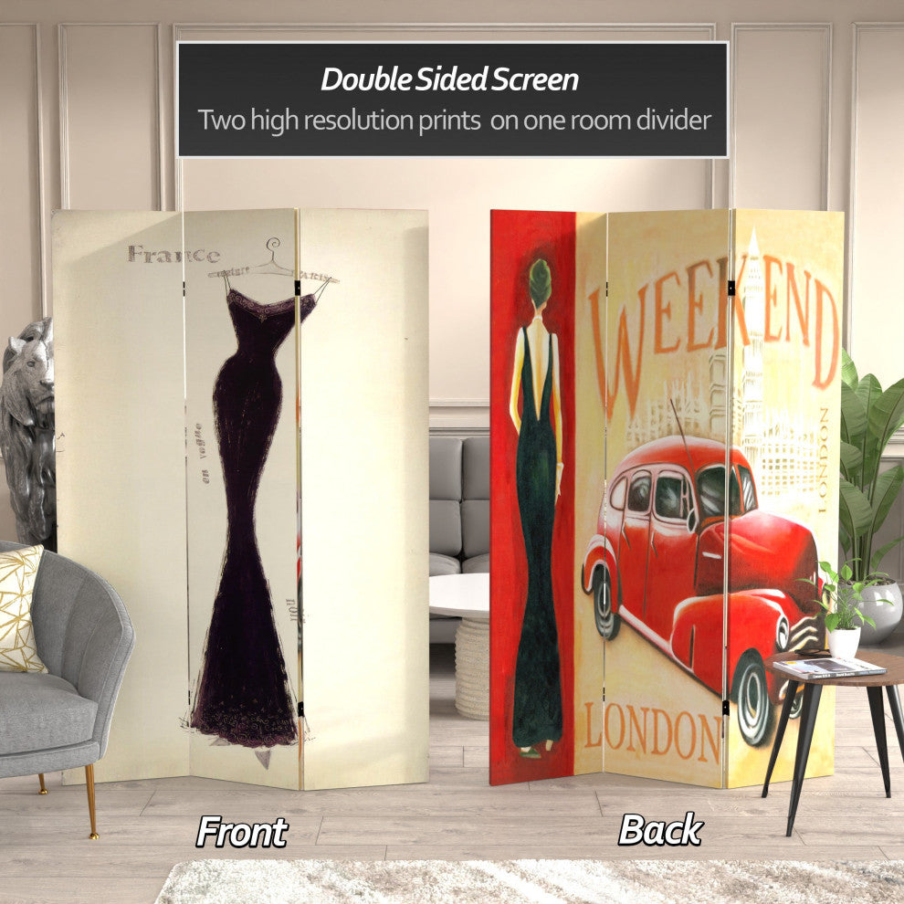 This unique screen is adorned with vintage graphic art, one side a 1920''s London travel poster, the other an eye catching impressionist style drawing of a dark colored evening gown. Simple, subtle, attractive imagery and rich colors make this screen a beautiful decorative accent for any room- living room, bedroom, dining or kitchen. A wonderful burst of color and shape that lifts the spirits of the space and the occupants. Each side has a different image as shown.