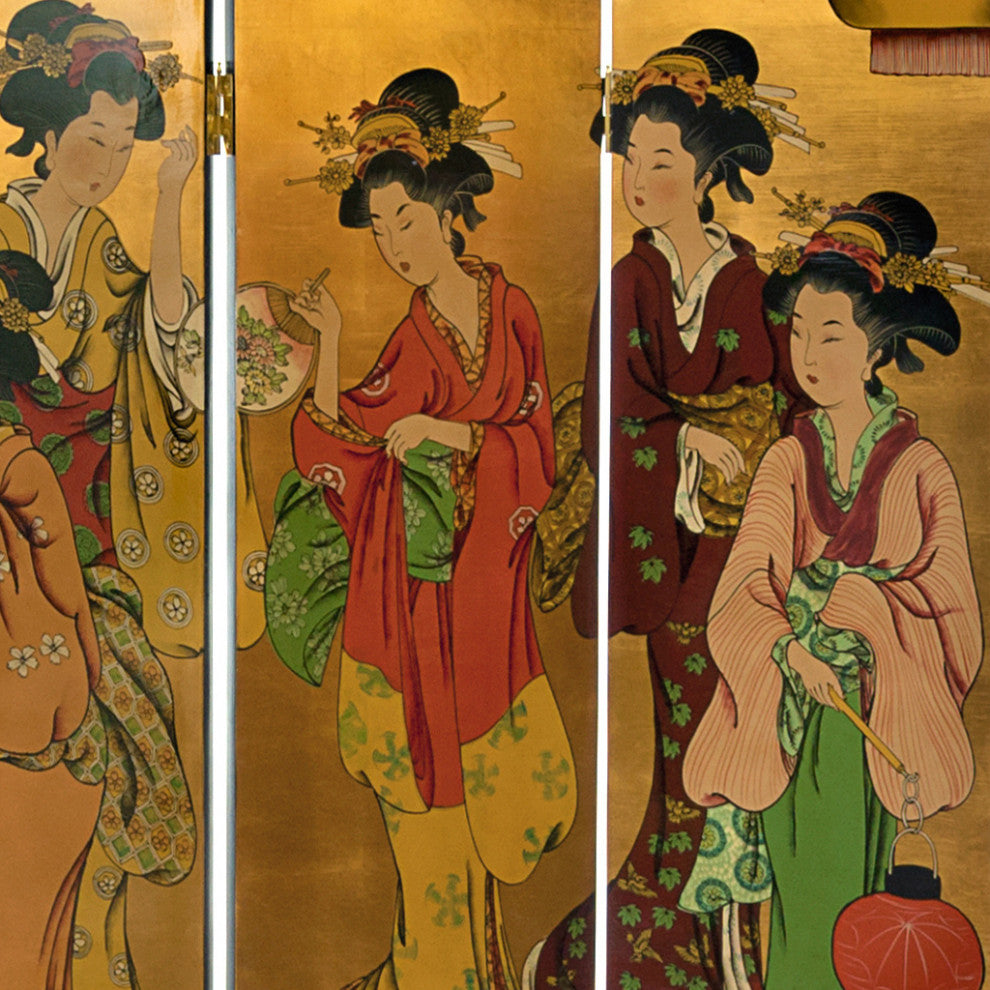 Hand Painted - A master artist with an eye for detail has painted geisha on authentic gold leaf gilded elm wood. Unique to the very brushstroke, no two pieces are exactly alike.