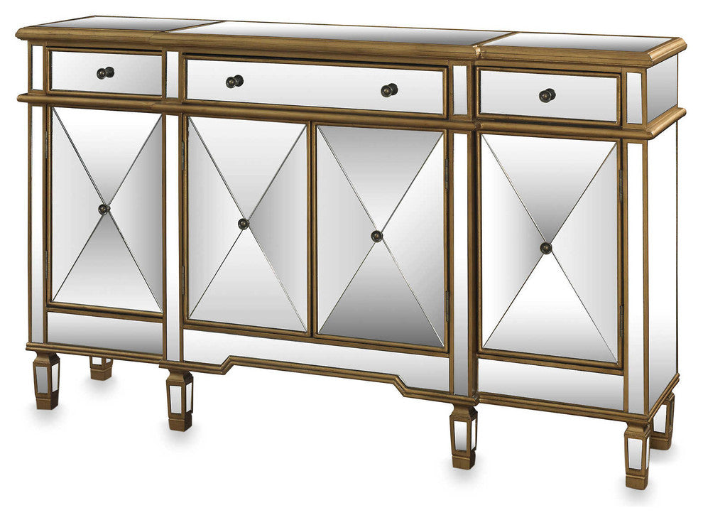 Dimensions: 60" W x 14" D x 36" HProduct SpecificationProduct Weight: 128 lbsIntroducing the Andrea hall console cabinet, a versatile and elegant piece designed to elevate your living space. Featuring large mirrored panels on all sides, this cabinet creates an illusion of extra space, making it perfect for your living room, entryway, or any area in need of added storage and style. The gold base color-tone with light brushed lining offers a refined appearance that complements any transitional decor.Product Features:No assembly required: Ready to use straight out of the box for effortless incorporationExpansive mirrored panels: Enhance the visual appeal and create an open, spacious feelRefined gold base color-tone: Adds a touch of sophistication to your living spaceLight brushed lining: Accentuates the console''s elegant designHalf-shelf compartments: Optimize storage options for various-sized itemsSpacious middle compartment: Measures 29"W x 13"D x 19"H for versatile storageRoomy side compartments: Measure 14"W x 12"D x 19"H for additional storage optionsRobust construction: Built to last with quality materials and craftsmanshipTransitional decor compatibility: Versatile design that seamlessly blends with a variety of styles