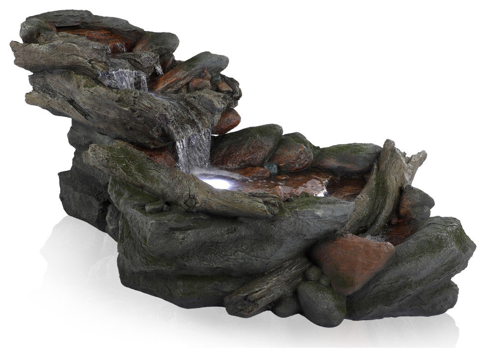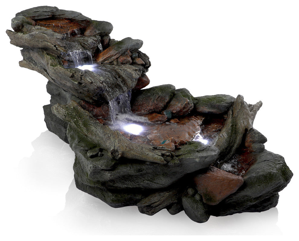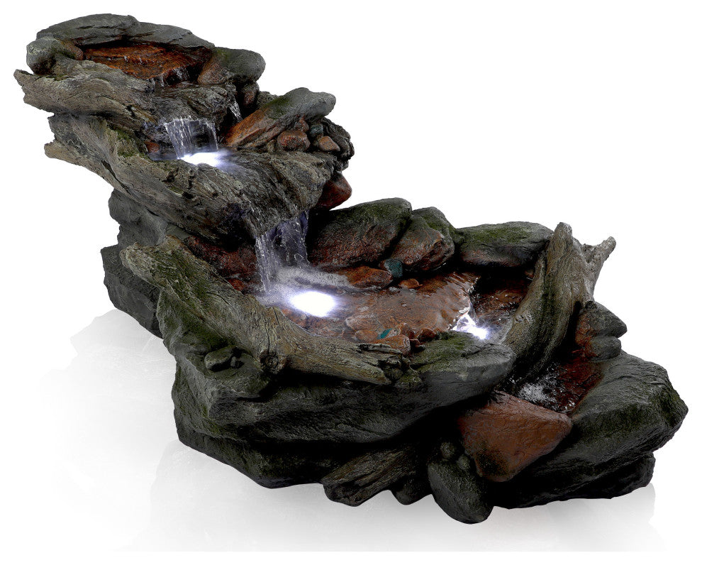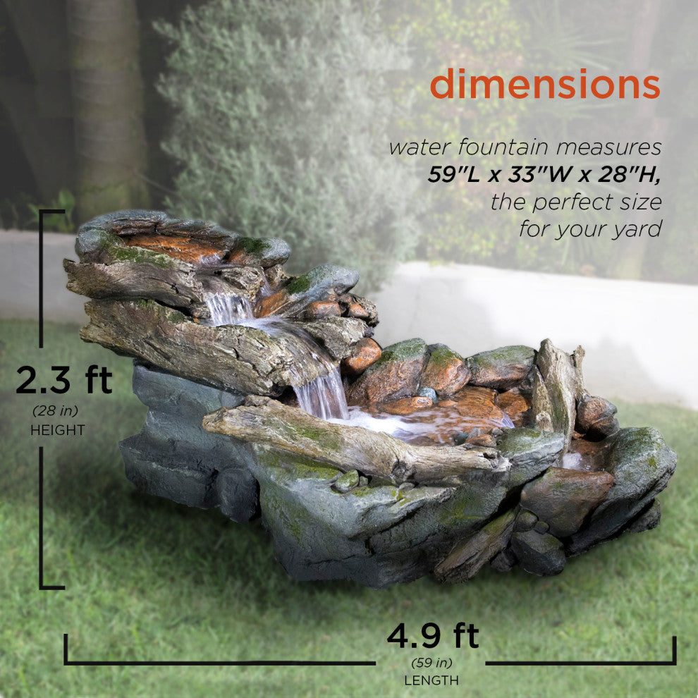 Relax and enjoy the sounds of nature with the Alpine Corporation 3-Tier Rock River Fountain! With this high-quality fountain, you can create a meditative, relaxing atmosphere, even in an urban jungle. The waterfall looks great in your garden, patio, deck, porch, or yard space. Take in the tranquil sounds of the water gently cascading over natural-looking gray stone and wood logs. The polystone and fiberglass construction is weatherproof, rust-resistant, and durable for years of quality use. To use, simply plug into an outdoor outlet, fill lower level with water, and watch as the interior pump creates a lovely water flow reminiscent of a lush rainforest river or stream. LED lights in each of the 3 tiers illuminate your space, drawing attention to the relaxing water pools day or night for added ambiance. Due to the hand-painted nature of the product, color variations may occur. With a 1-year warranty, you can be confident in the quality of your purchase. Fountain measures 60"L x 33"W x 28"H for use in yards of any size. Alpine Corporation is one of America''s leading designers, importers, and distributors of superior quality home and garden decor products. Alpine Corporation''s award winning in-house design team continuously develops new and innovative "statement pieces" for your home and garden. Your indoor and outdoor living spaces will be the envy of the neighborhood with our wide assortment of fresh, fashionable and contemporary products, from beautifully crafted solar garden stakes featuring patented motion and fiber optic lighting technology to beautiful fountains and delightful bird baths and feeders.
