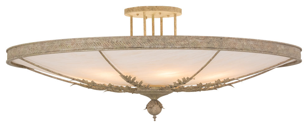 Adorned with steel accents that replicate Acanthus leaves in a handsome Pate finish, this large contoured ceiling fixture features a Frosted Faux Alabaster acrylic shade with decorative trim, a ball point accent and matching hardware. This fixture is ideal for lobbies, conference rooms and other large spaces in residential and commercial settings. Hoja is custom crafted in the Meyda facility in Yorkville, NY. Customizes, styles, colors and dimmable energy efficient lamping options are available.