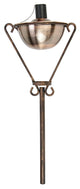 Set the mood and add elegance to your outdoor celebration with this copper oil torch creating warmth to your decor. Warm sophisticated and the classic lodge look refined for memorable gatherings wherever you call home. The realistic look of it makes your living spaces more lifelike. Features: Large half-moon shaped brushed copper oil holder sits in a distressed copper holder Includes long-lasting fiberglass wick and black metal snuffer Stakes directly into the ground For outdoor use only Dimensions: 61" high x 8.75" wide Material(s): iron and metal Note: oil is not included