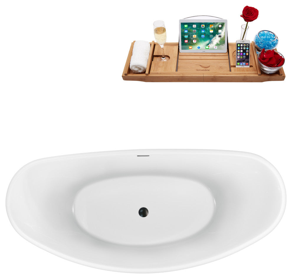 Measuring at 63 inches, the 63'''' Streamline N951BL Freestanding Tub and Tray With Internal Drain ensures plenty of room for you to feel comfortable while immersing yourself in 53 gallons of water. The bathtub is crafted from durable 100% pure acrylic which ensures a simple and clean surface, while the overflow design guarantees a seamless bathing experience. This model comes with a matte black pop up drain.