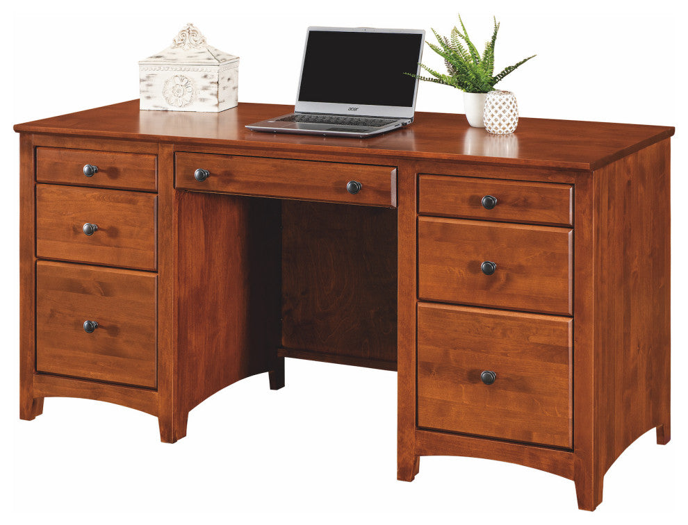 The 7 Drawer Desk is made with American solid alder for a sturdy, long-lasting home office addition. American Amish craftsmen apply the finish by hand resulting in a high-quality, smooth, and beautiful desk. Keep your power tools stored away - this desk is ready to use after you unbox it. Pair it with our matching files or cabinets or enjoy it on its own!- 100% solid wood - built to last without any particleboard or fiberboard.- Built in the USA with an Amish hand-finish.- Use it upon delivery with no assembly required.- Create a matching home office with our desks, cabinets, and files in the same finishes and height.- Top drawer dimensions: 2 1/8" h x 17" w x 12" d- Middle drawer dimensions: 5 3/8" h x 17" w x 12" d- Bottom drawer dimensions: 9 5/8" h x 17" w x 12" d