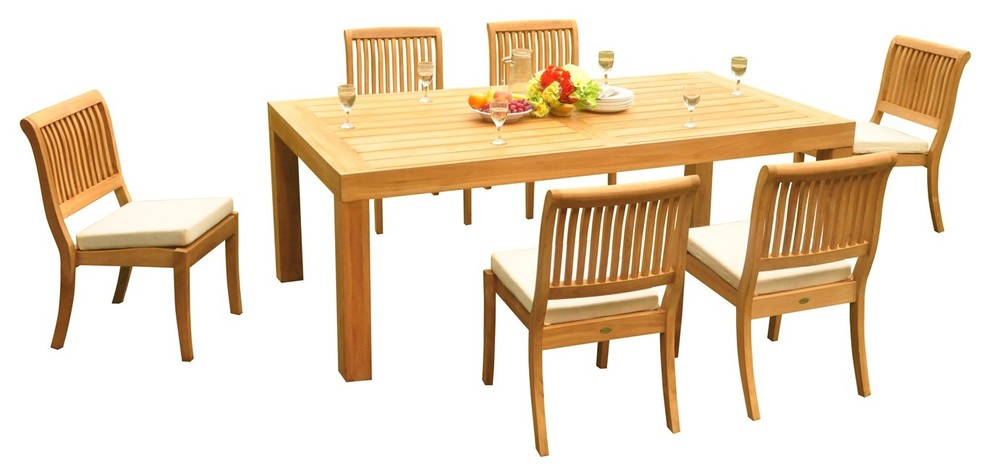 Set includes: 86" Canberra Rectangle Fixed Dining Table and 6 Stacking Armless Chairs.The chairs will stack for convenient storage in limited spaces.Dining Table features wide-plank geometric angles and clean lines smooth sanded teak.Unique 4" thick legs provide clean composition in a contemporary profile with modern flair.There is a 2" hole for umbrella in middle of table, lid (wooden cap) provided to cover hole when umbrella not in use.Stainless steel is also used to complement the beauty of teak in the construction of our furniture.All critical connections are made in the traditional mortise-and-tenon joinery with the strictest tolerances. We use only select kiln-dried teakwood.Sunbrella Fabric Cushions are sold separately.Assembly: Chairs comes fully assembled. Table requires very little assembly (Hardware and instructions included). Assembly is quick and simple.Please search Houzz for our tailor made, high quality cushions for this furniture set by looking for "Sunbrella Fabric Outdoor Cushion" in the Houzz search tool!Table Dimension: 86" Length x 43" Width x 30" Height, 2" Umbrella Hole is in the center of the tableStacking Armless Chair Dimension: 18.5" Width x 19" Depth x 34.5" Height; Seat Dimensions: 17" Width x 17" Depth