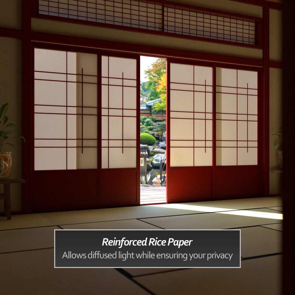 Step into the world of Japanese architectural heritage with the Red Lantern 7 ft. Tall Shoji Sliding Door Kit. Inspired by traditional shoji screens, which have been an integral part of Japanese architecture for centuries, this sliding door set will transform your home with the artistry and philosophy that have shaped Japanese living spaces.Shoji screens have been used in Japanese homes since the 8th century, providing a delicate balance between privacy and natural light. This ancient design philosophy meets modern functionality as the sliding doors offer a contemporary solution for dividing spaces while maintaining an open atmosphere.This kit includes sliding doors, top and bottom tracks, and right and left door jambs. The rough opening (outside dimension) measures approximately 83.00"H x 73.50"W x 3.50"D, with tracks and jambs approximately 1.75" thick x 3.50" deep. Each door measures approximately 36.00"W x 80.00"H x 1.00"D, allowing for a seamless integration into your living space.Our sliding shoji doors invite you to experience the timeless beauty and functionality that have shaped Japanese interiors for generations. Transform your space into a sanctuary of balance and tranquility, where modern design meets ancient wisdom.Reinforced Rice Paper: Crafted with tough, fiber-reinforced washi rice paper, this shoji door kit allows diffused natural light to filter through while ensuring your privacy. The extra strong rice paper stands up to regular usage and foot traffic.Scandinavian Spruce Frame: Crafted from durable yet lightweight spruce wood, these shoji doors boast a sturdy construction that is light to the touch and opens smoothly and effortlessly. An enlarged kickplate area protects the rice paper from the most common bumps and scratches.Dual-track design: The base is equipped with two tracks that enable each shoji door to move freely in either direction, providing seamless and versatile access.Versatile Size and Dimensions: Once assembled the kit is 83" tall x 73 _" wide x 3 _" deep. The tracks and jambs are approx. 1 _" thick. x 3 _" deep. The two doors each measure 36" x 80" x 1"Barn Door Compatible: For those who prefer the aesthetic of barn doors over traditional sliding doors, this kit can easily be adapted with hanging hardware, available at your local hardware retailer.