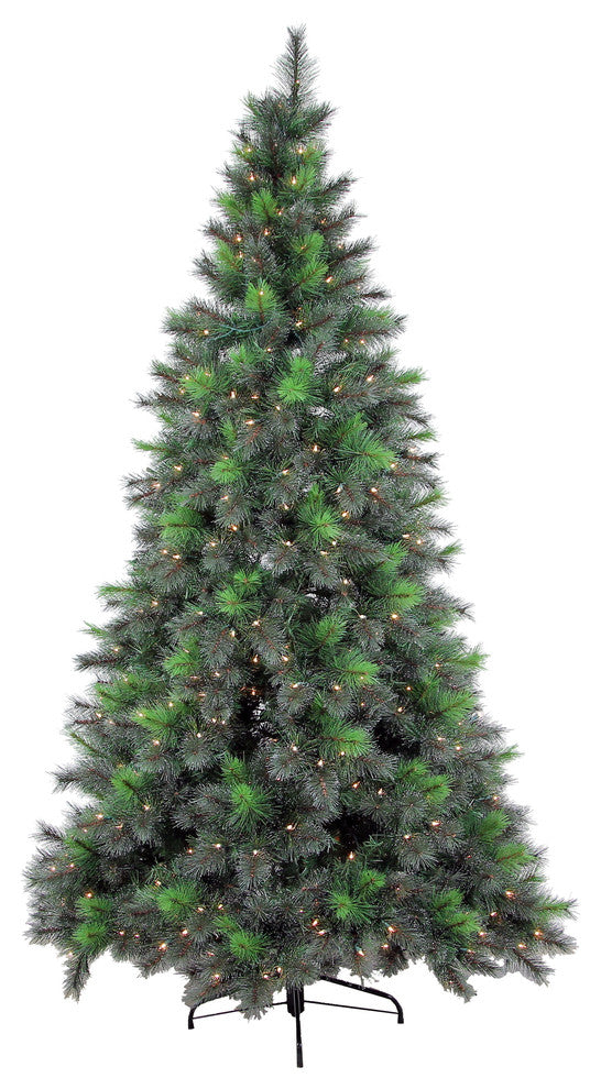 Snow is lightly falling, leaving the sliver crystal on the pine needle tips...Looking at it makes you wonder how detail an artificial pine tree can be built. The 7.5 feet Artificial Christmas Tree comes with 450 Clear Lights and 1059 Tips with Feel-Real pine needles. Some needle tips are frosted in silver to create a stunning realism of light snow. The tree consists of 450 Pre-Lit clear lights with bulb-lock feature to keep bulbs from falling out. Extra bulbs and fuses are also included in case you need a few spares. The lights operate at 110 volt and can be directly plugged to a normal wall mounted power outlet (UL Certified). It can be easily assembled with hinged-branch construction and comes with a sturdy metal tree stand. Size: 44"L x 44"D x 92"H. Dimensions based on image shown. Primping required to match on the image shown.