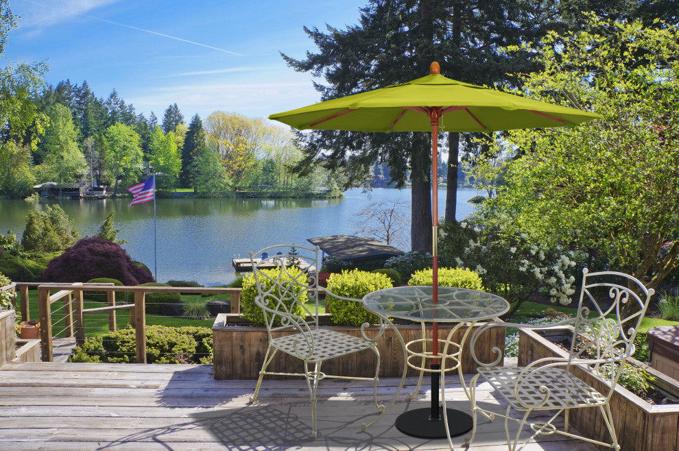 The classic look of a traditional wood market umbrella by California Umbrella is captured by the MARE design series. The hallmark of the MARE series is the beautiful 100% marenti wood pole and rib system. The dark stained finish over a traditional marenti wood is perfect for outdoor dining rooms and poolside d-cor. The deluxe push lift system ensures a long lasting shade experience that commercial customers demand. This umbrella also features Sunbrella fabrics, which are built on a foundation of solution-dyed acrylic yarn, the most resilient and solid material for prolonged sun exposure, to offer even longer color retention rating than competing material sources.Product Features-Sunbrella Fabric-7.5- size canopy-High durability resin hub-8 marenti wood ribs-Durable 1.5" marenti wood pole-Deluxe push lift system-Base sold separately