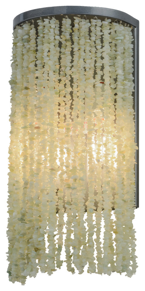 Idyllic strands of Natural Jadestone charms cascade like a waterfall at the forefront of lighting fashion. Experience the luck and tranquility associated with the enduring Jadestone. Decorative wall fixture for a variety of applications including tropical, casual and resort environments or those that aspire to be just that. Frame and hardware finished in Black Chrome. Custom crafted in Yorkville, NY.