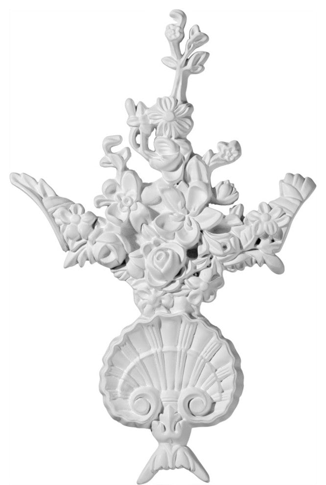 8 1/4"W x 12 1/2"H x 1 1/4"P Flower Onlay. Our appliques and onlays are the perfect accent pieces to cabinetry, furniture, fireplace mantels, ceilings, and more. Each pattern is carefully crafted after traditional and historical designs. Each polyurethane piece is easily installed, just like wood pieces, with simple glues and finish nails. Another benefit of polyurethane is it will not rot or crack, and is impervious to insect manifestations. It comes to you factory primed and ready for your paint, faux finish, gel stain, marbleizing and more.