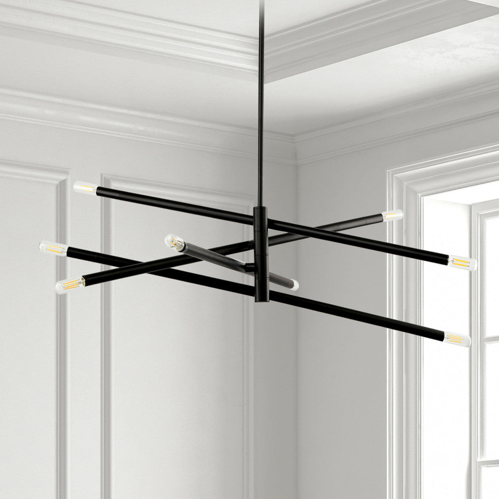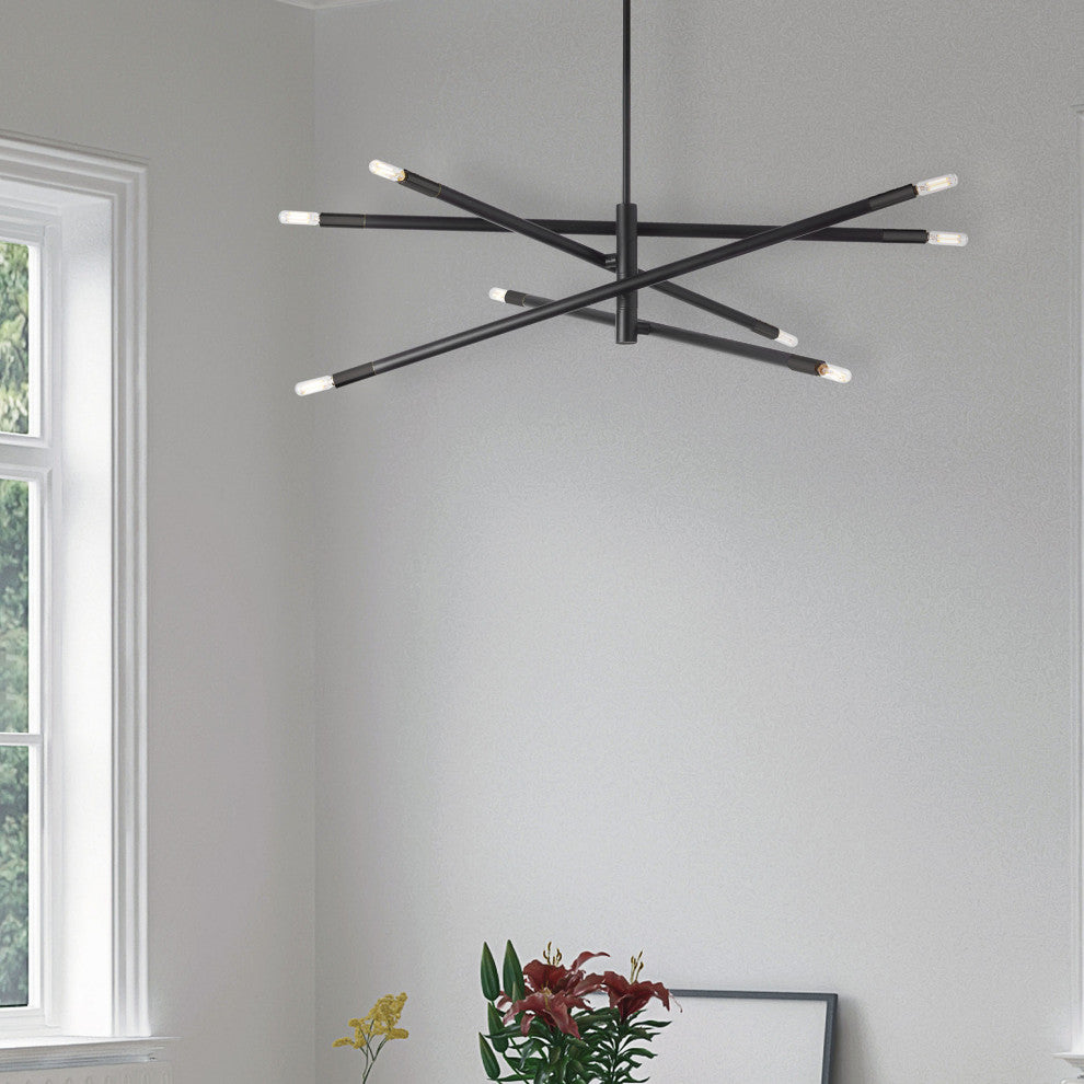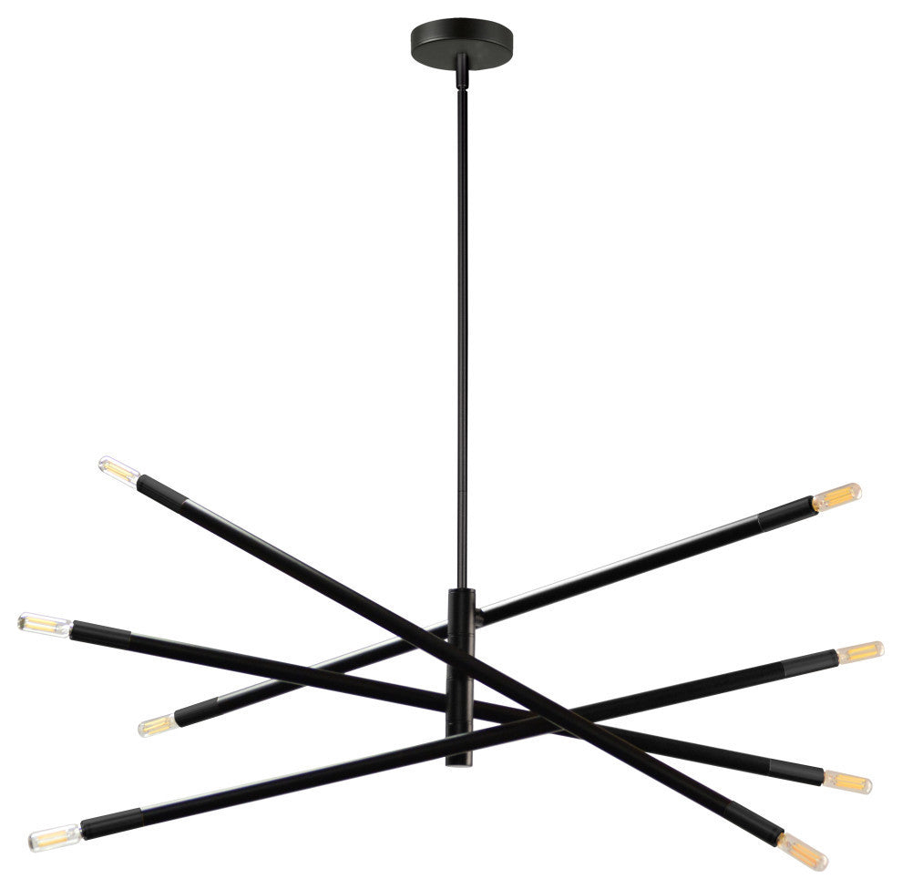 8 Light Incandescent Pendant, Matte BlackThe Wand family of lighting is based on a beautifully simple concept classic linear design. The look is modern, but with a nod to the traditional motifs of mid-century modernism and even early 20th century forms. The frame is crafted in metal with either straight or elegantly curved arms in stylish matte black finish with optional aged brass accents. It"™s a look with inherent drama and adds a note of undeniable luxury to your fashionable modern neutrals or bright palette. Wand lighting is versatile, and suitable for most rooms of your home from the foyer to bedroom.