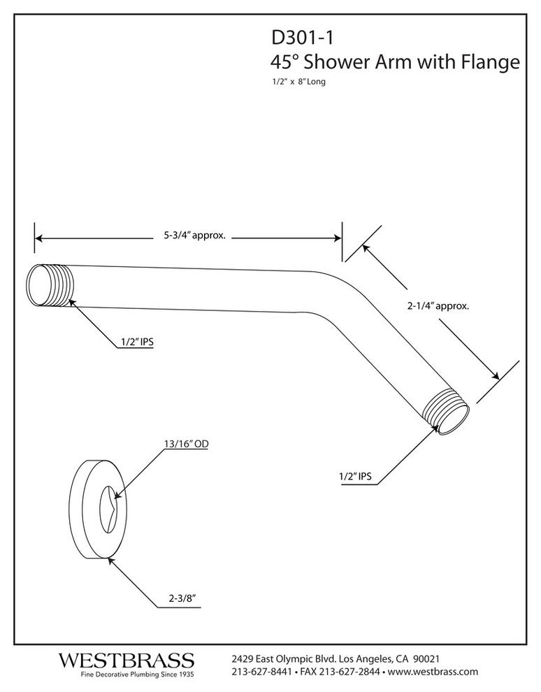 This 8 in. wall-mounted shower arm from Westbrass is the last piece you are looking for to complete your shower installation. It mounts to the wall at a 90-degree angle with a gentle 45 degree, downward curve. Available in many stylish finishes, this item is sure to complement your existing fixtures. A Sure Grip shower flange, finishes the installation. Designed to extend shower head into the shower for easy bathing.