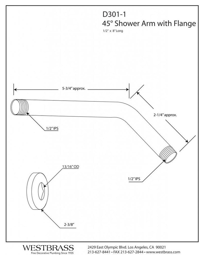This 8 in. wall-mounted shower arm from Westbrass is the last piece you are looking for to complete your shower installation. It mounts to the wall at a 90-degree angle with a gentle 45 degree, downward curve. Available in many stylish finishes, this item is sure to complement your existing fixtures. A Sure Grip shower flange, finishes the installation. Designed to extend shower head into the shower for easy bathing.