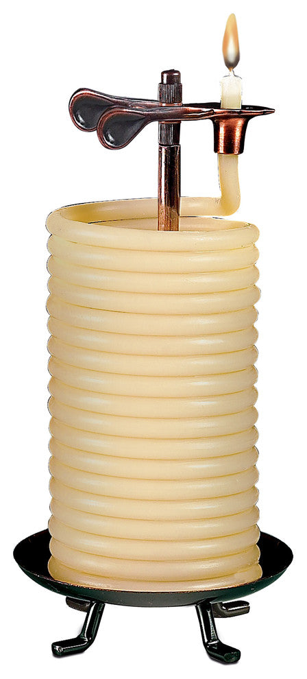 With hours of dreamy candlelight in your Candle by the Hour, you can set the amount of time it burns, hour by glowing hour. Simply feed the pliable bees wax coil through the candle clip in increments of 3 inches or less. Three inches of candle will for approximately 1hour. Set your nights alight with the Candle By The Hour. Burning time is 80 hours. Features and details: Quirky bees wax candle coil is sculptural like. Candle reaches upwards in a spiral from a metal burning plate with metal calipers griping the candle Unique conversation piece for the living room. Burns as long as you tell it to, then extinguishes itself. Candle size - 5" Diam x 10.55"H. Made in Vietnam.