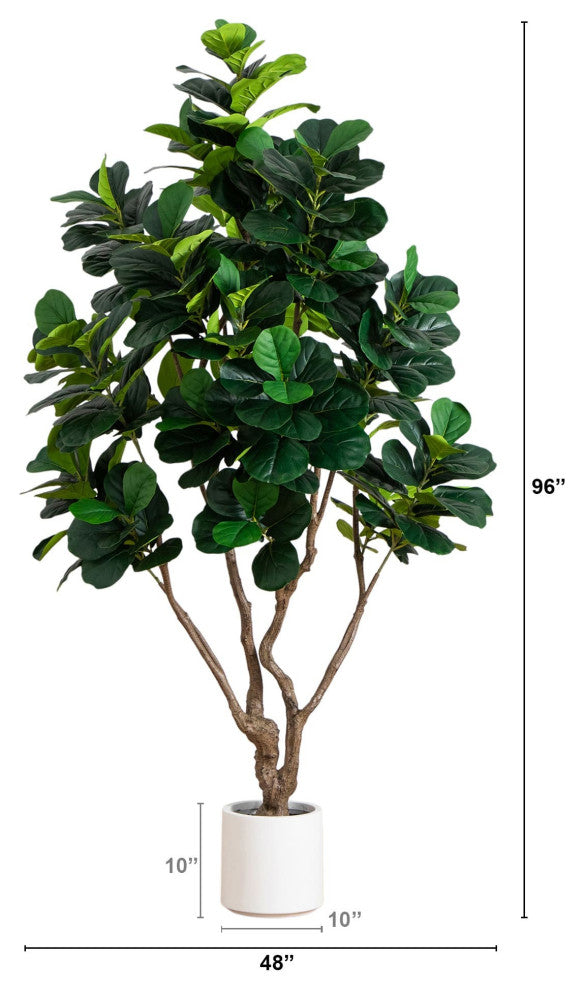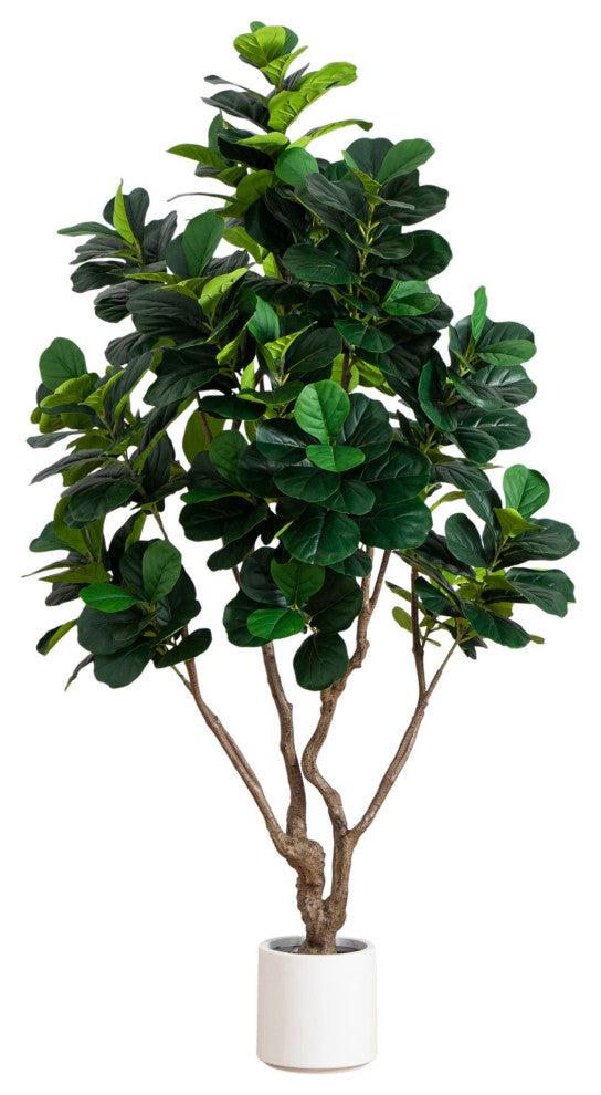 A grand artificial fiddle leaf fig tree, that''s sure to be the center of attention in any gathering. Inspired by the jungles of Central Africa, this tree is difficult to maintain, but you can still get the verdant look with this piece sans the care. Crafted from high-quality materials, bend the branches to fit in your space and create a custom look. Standing an impressive 8-Ft from a white decorative planter, showcase in any area. The full head of leaves brings the tropics no matter where you live, anytime.