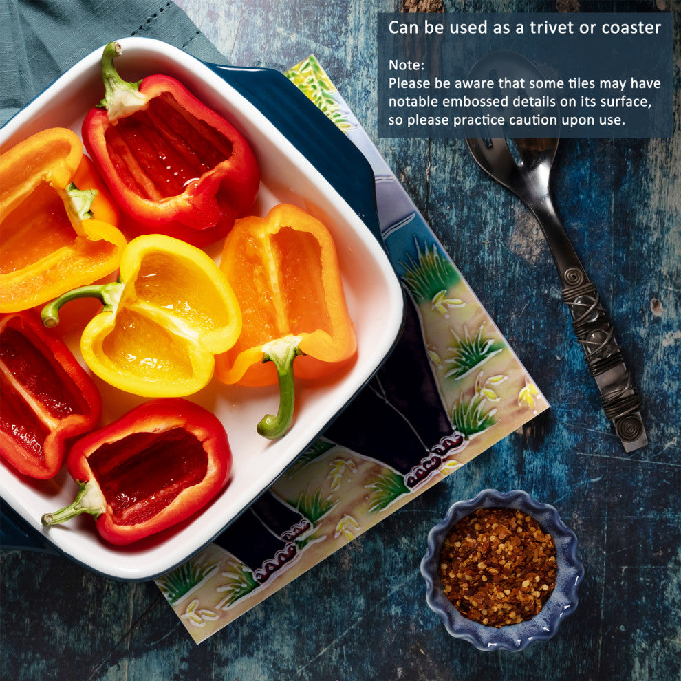 For convenience, the art tiles come with backings which enable them to stand by themselves like picture frames or be hung on the wall with a nail.