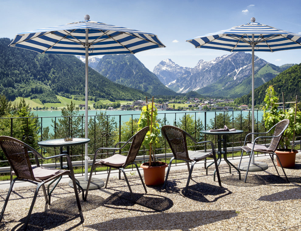 This heavy duty top seller 9 foot commercial grade umbrella offers all the features a residential or commercial owner demand with a robust, commercial grade aluminum frame. The two-section aluminum pole with a 0.08 inch wall thickness and fiberglass rib framework has superior stability and is perfect for demanding commercial conditions. The strong aluminum pole frame is matched by a simple and efficient manual push lift system, which compliments a resilient and easy to use umbrella. This umbrella also features Sunbrella fabrics, which are built on a foundation of solution-dyed acrylic yarn, the most resilient and solid material for prolonged sun exposure, to offer even longer color retention rating than competing material sources.