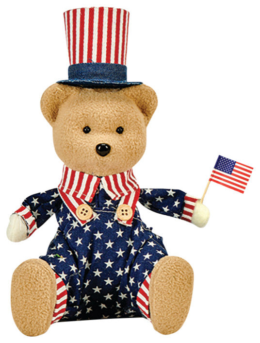 Welcome the patriotic holidays the right way by adding this cute bear to your tabletop decoration. It is dressed in overalls with a Uncle Sam hatand holding a flag. Perfect size to place in any tabletop setting.