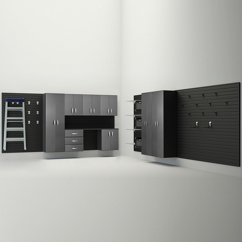 The Deluxe is a one-stop solution for getting your workshop organized. Use the Deluxe in the garage or shop to customize the best design for your space using 168 square feet of wall panel, eight cabinets and more than 20 accessories for storing, shelving and more. The Deluxe, and other products from Flow Wall System, help your floor plan achieve more function with good-looking storage solutions.Customizable garage storage systemPaneled design allows for custom arrangementsCabinets come with interior shelves and attach to paneling leaving floors freeSteel hooks are resistant to rust and scratches1 year manufacturer''s warrantyAssembly is requiredPaneling: 168 sq. ft. of panelingCabinets: 3 tall cabinets, base cabinet, 3 upper cabinets, drawer cabinetAccessories: Drawer bins, 10 "X" hooks, 6 4-prong hooks, dual-bracket hook, 4 metal bracket shelves, 3 soft storage binsWeight capacity: 100 lbs. per sq. ft. Color: Black and silverMaterials: PVC, MDF and laminateOverall dimensions as shown: W 336" x D 17" x H 72"Tall cabinets: W 24" x D 16" x H 72" (3 shelves)Base cabinet: W 24" x D 16" x H 26" (1 shelf)Upper cabinets: W 24" x D 12" x H 26" (1 shelf)Drawer cabinet: W 24" x D 16" x H 26"Drawer bins: W 21.5" x D 15" x H 6.25"Soft bins: W 24" x D 12" x H 12"Bracket shelves: W 24" x D 12"